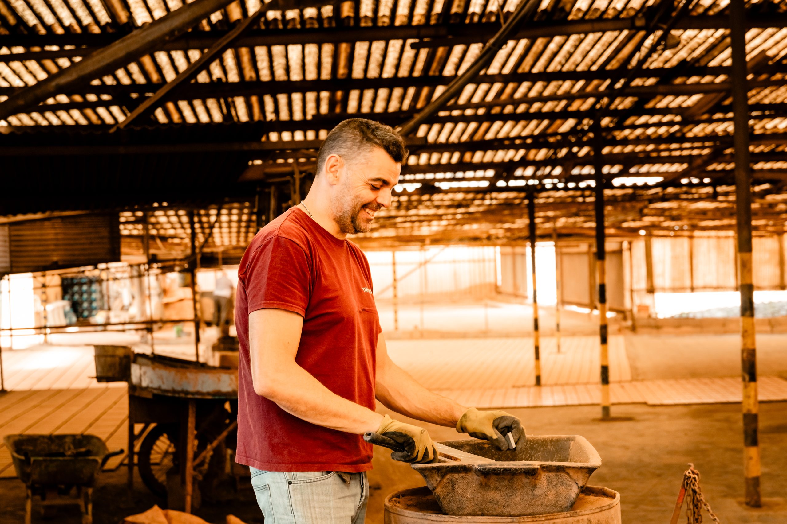 - Acende-se o forno com lenha, seguido de bagaço e casca de amêndoa o que permite que as peças sejam cozidas a altas temperaturas.